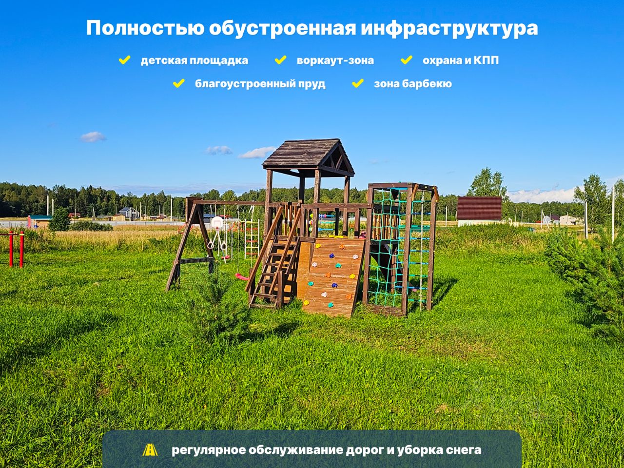 Инфраструктура поселка Обустроен и заселён Детская площадка Воркаут-зона Охрана, КПП Общественный пруд для купания (1 Га, благоустроен) Зона барбекю (в процессе обустройства) Зимой чистка снега, ремонт дорог
