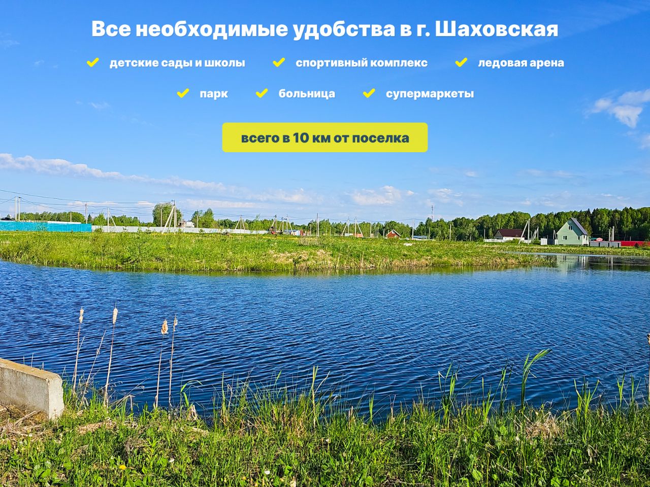 Ближайший город — Шаховская (10 км) Детские сады и школы Новый Дом детского творчества и развивающие центры для детей Спорткомплекс и ледовая арена 5 крытых всесезонных теннисных кортов Парк с военной техникой и детский парк Больница и поликлиника Банки и супермаркеты: Дикси, Магнит, Пятерочка, Афина, ВкусВилл